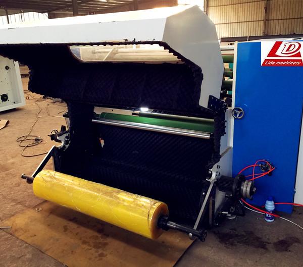 This LD-1300B adhesive tape cutting machine includes four parts: Slitting machine, core loader, core cutter and rewinder.